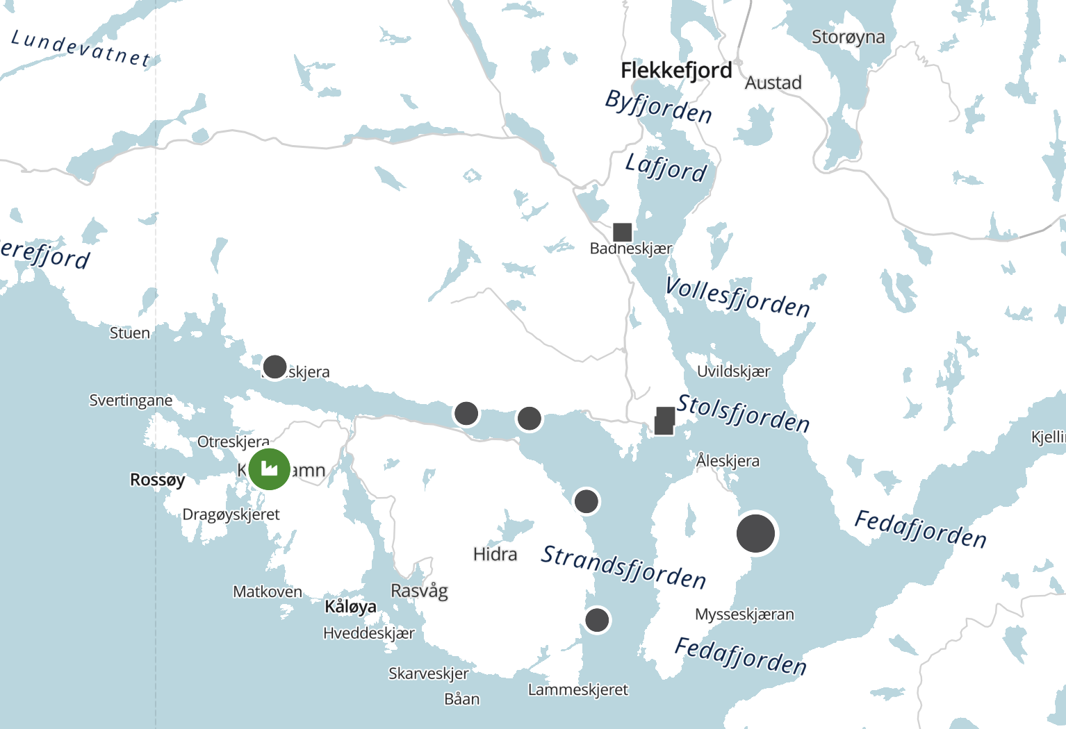 Mowi har flere lokaliteter i nærheten av Flekkefjord. Den største sirkelen nede til høyre markerer lokaliteten Pinnen. Grafikk: Barentswatch