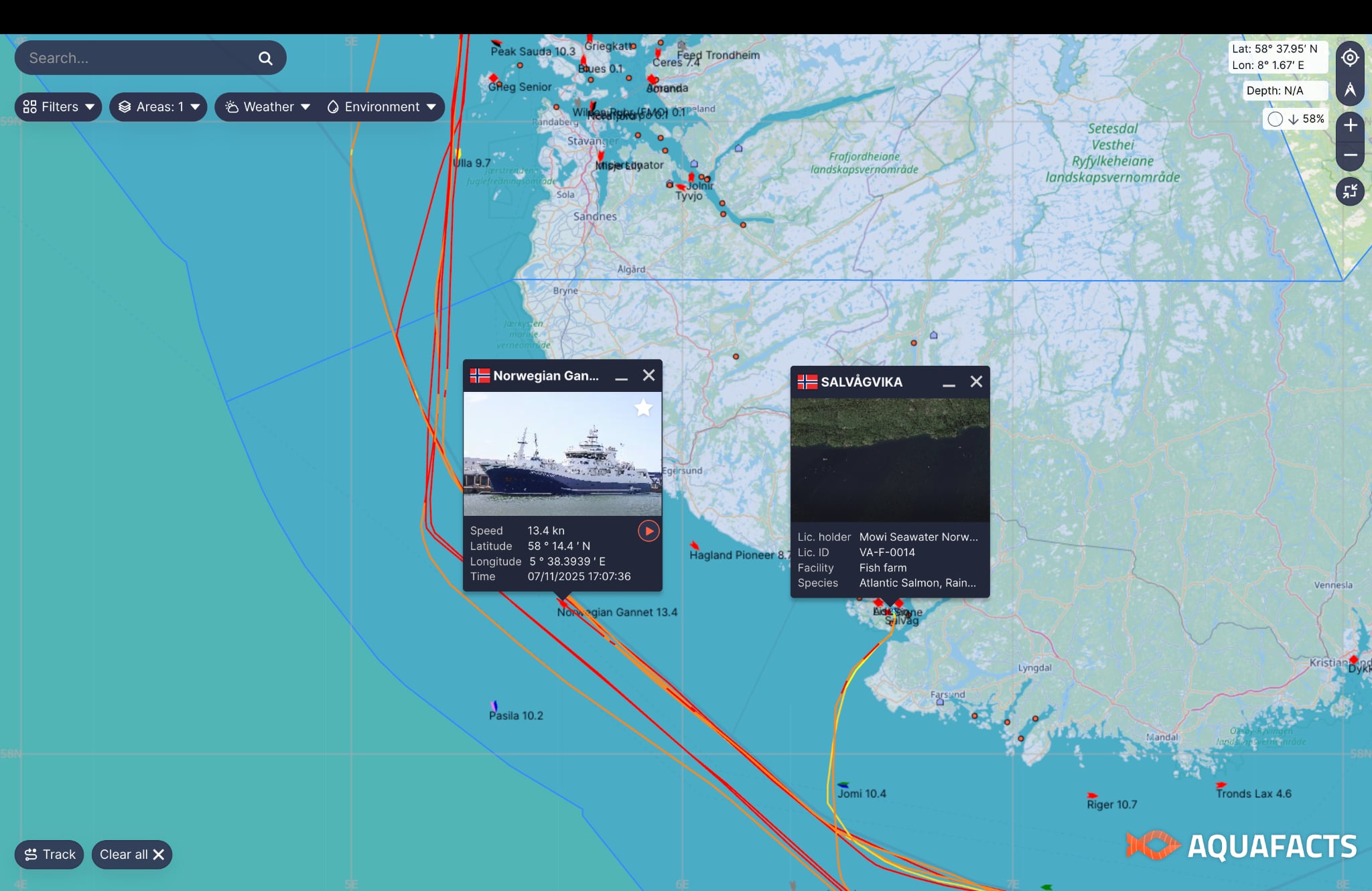 “Norwegian Gannet” sitt seilingsmønster de siste dagene. Kilde: Aquafacts