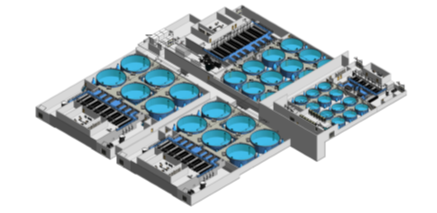 Laxey Smolt Station II vil bestå av syv RAS-systemer når det er fullt utbygd, med en årlig produksjon på 15 millioner smolt på 100 gram. Design: AKVA group.