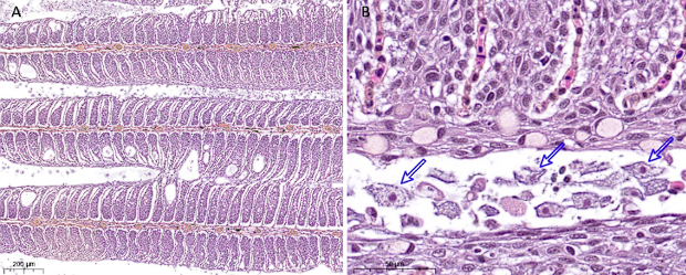Histologiske bilder (HES-farget) av gjeller fra atlantisk laks som viser (A) uttalt, diffus hyperplasi av epitel resulterende i segmental sammenvoksning av lameller med sparsom forekomst av kavernedannelser, samt (B) forekomst av amøber (eksempler indikert med piler) i tilknytning til AGD-lesjonene. PatoGen, Anette Nordby.