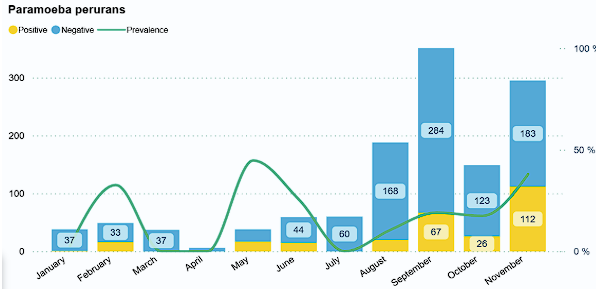 AGD forårsaket av (Neo)paramoeba perurans sprer seg nordover etter to varme somre, med utbrudd i PO8 og PO9.