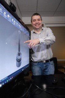 Nyvinningen er utviklet i tett samarbeid med kunden Eyvi. Her viser Asgeir Djupvik en 3D-modell av den komplette sentersøylen, hvor blant annet all mekanikk er flyttet inn i kjernen for å bedre fiskevelferden og forenkle vedlikeholdet. Foto: Josefine Spiro