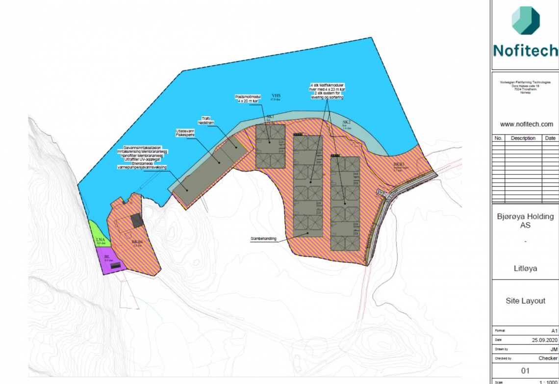 På Litløya i Flatanger kommune planlegger Bjørøya å bygge et landbasert anlegg for både postsmolt og matfisk av laks. Konseptskisser fra 2020 viser at oppdrettsselskapet planlegger en postsmoltmodul på 4×20 meter kar og fire matfiskmoduler 4×23 meter kar.
