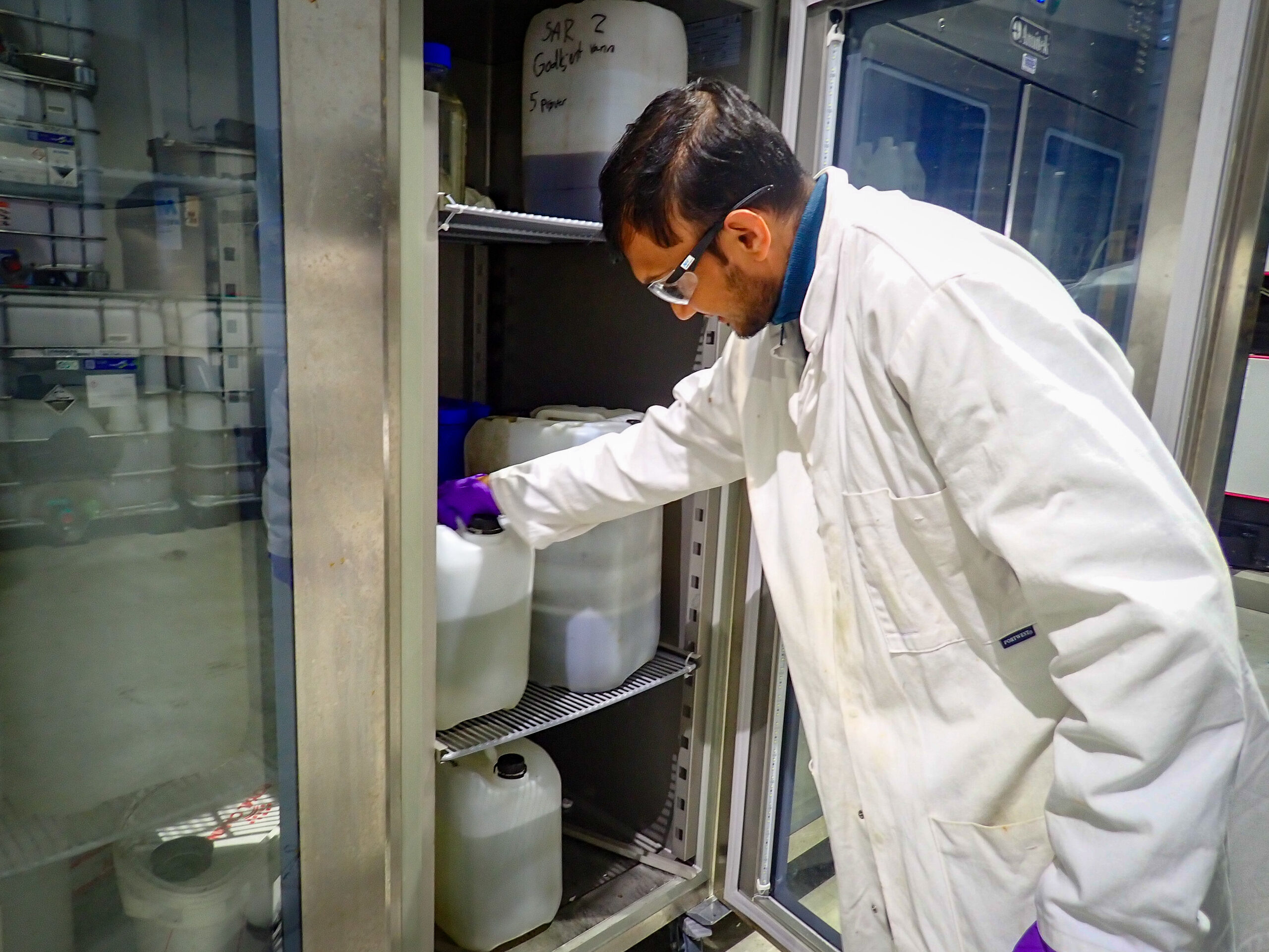 Prosessingeniør Sachintha Manoj Bodahannadige henter ut vann som skal testes. Foto: Tina Totland Jenssen