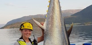 Her poserer Nina med dagens fangst fra oppdrettsmerden