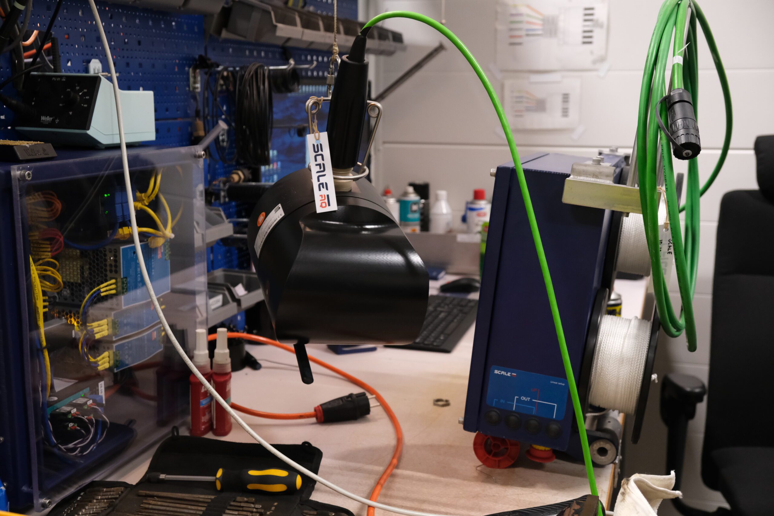 Vi blir vist inn i et rom fylt med arbeidsbenker, verktøykasser og spesialutstyr. På bordene ligger undervannskameraer, kabler og sensorer som har vært ute i sjøen i årevis.