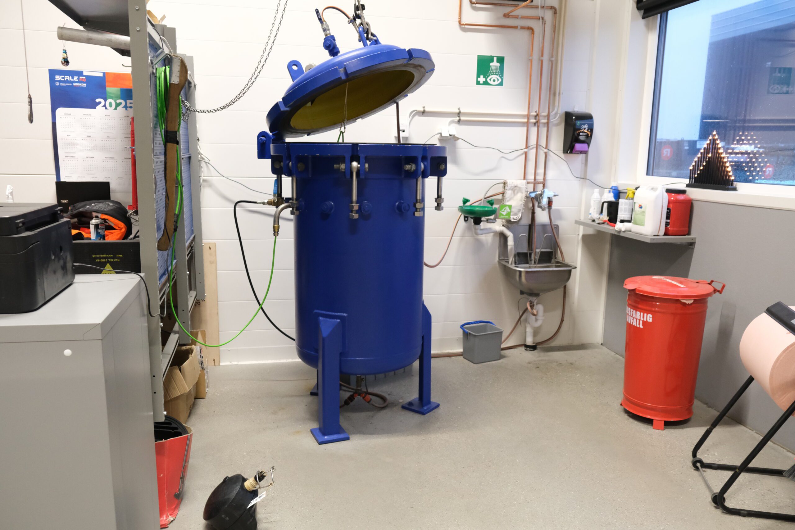 I hjørnet av rommet står en stor trykktank i stål, med manometre og ventiler.