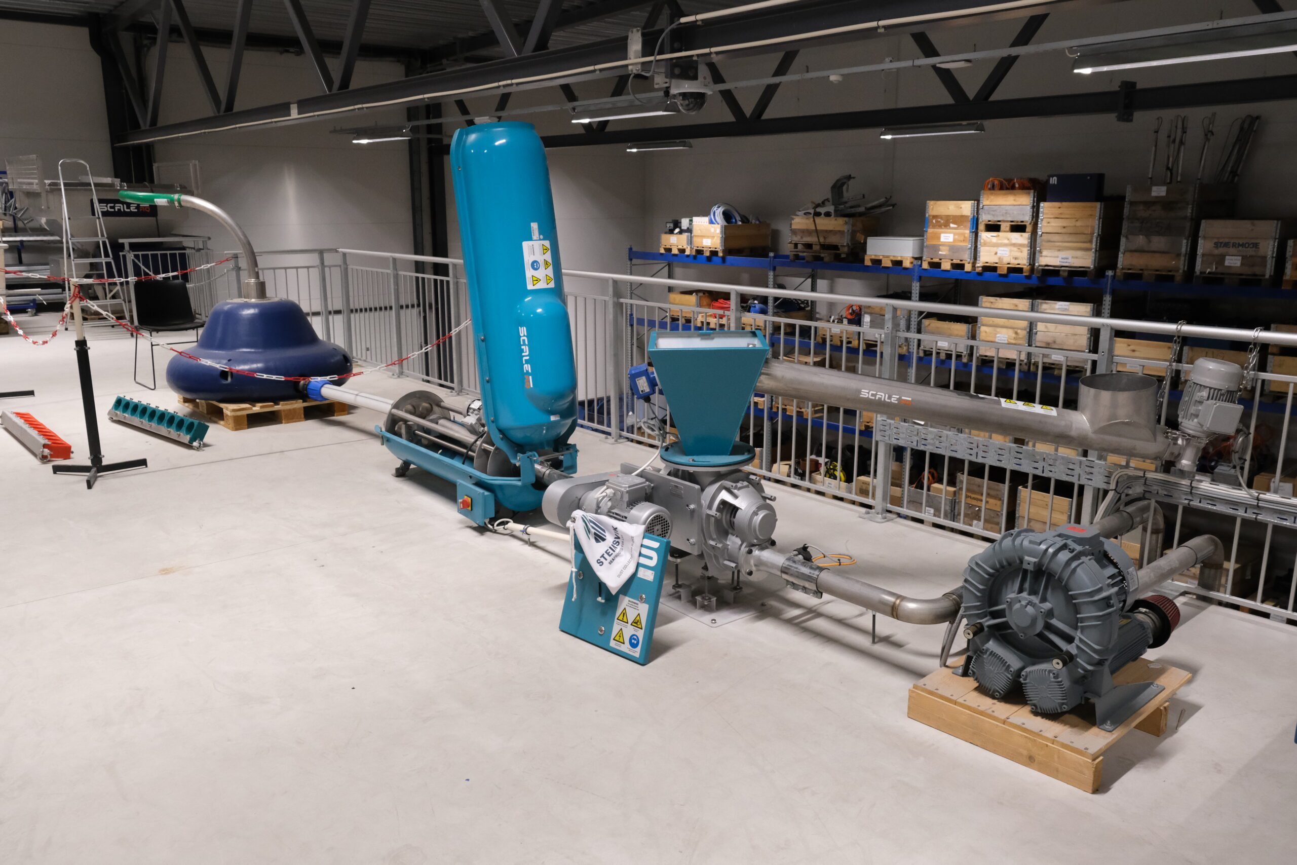 I andre etasje av avdelingen har ScaleAQ bygget en enkel fôringslinje for opplæring. Rør og koblinger er satt opp slik at nye ansatte kan lære hvordan systemet fungerer.