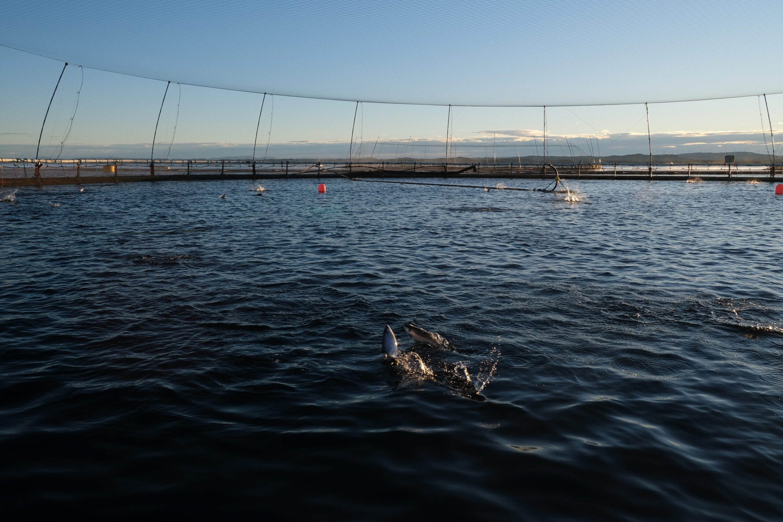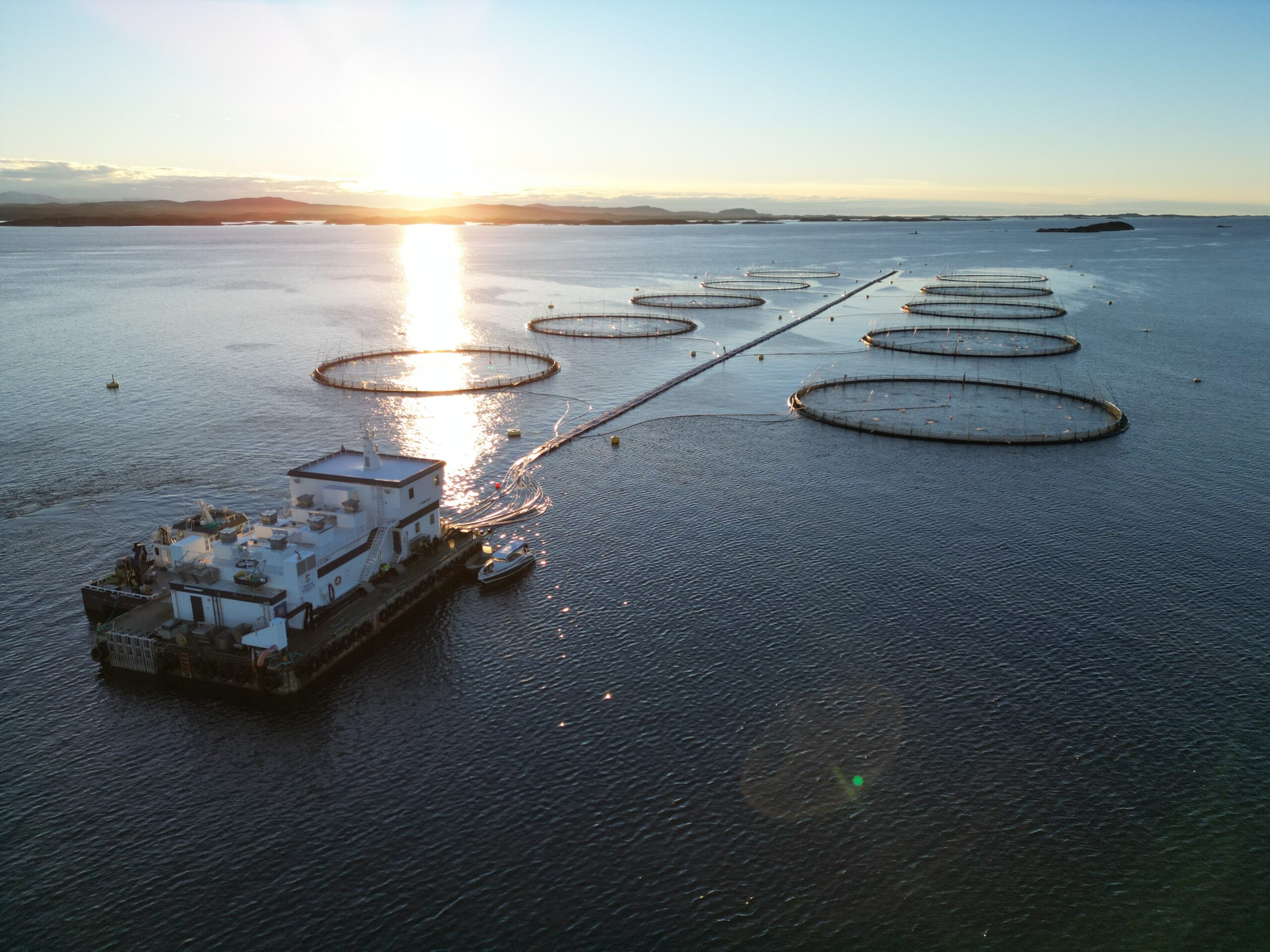På Frøya kan havet skifte fra vakkert til brutalt på et øyeblikk. I dag viser det seg fra sin mildeste side: Vintersolen ligger lavt og glitrer i en sjøflate som er så rolig at merdene speiler seg i den. Laksen hopper sporadisk i overflaten og bryter stillheten med små, raske plask.
