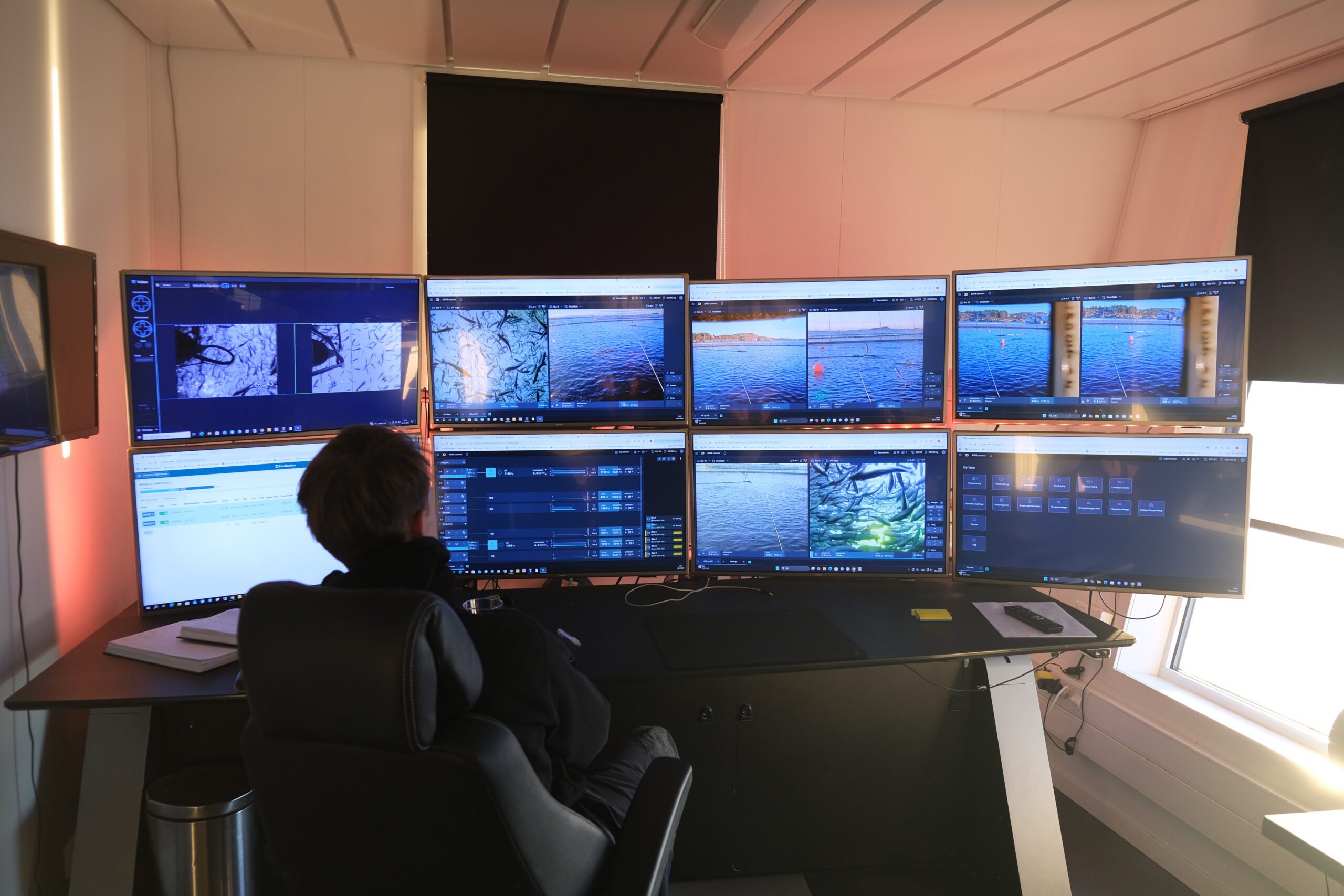 Tilvekstoperatør Andreas Johansen følger nøye med på kameraene som viser aktiviteten i merdene.