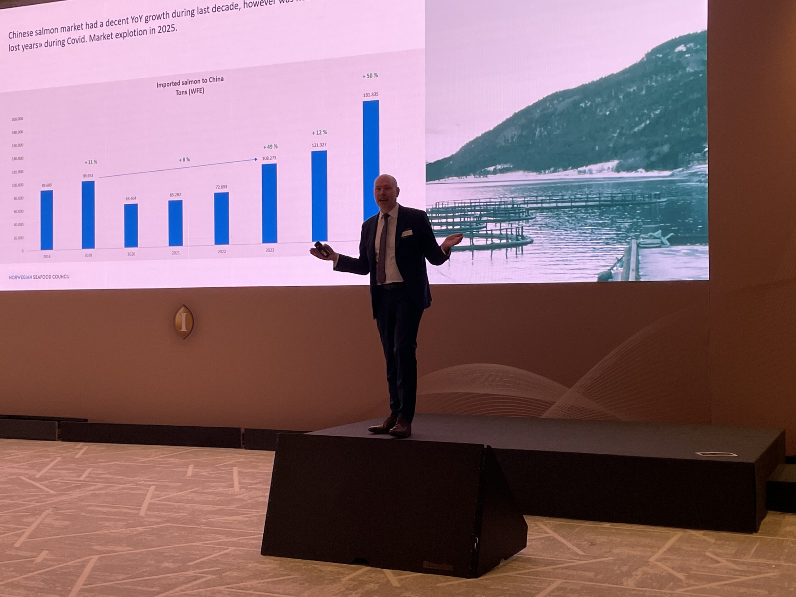 – USA er verdens klart største marked for laks, ingen tvil om det, men i fjor importerte Kina 50 prosent mer enn året før, sier Sigmund Bjørgo, Norges fiskeriutsending til Kina.