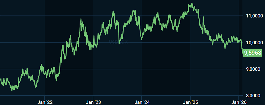 Og nå taper den sin verdi fort. På et drøyt år har dollaren falt fra 11,40 til 9,59 mot norske kroner.