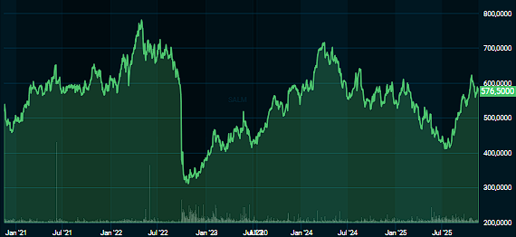 «Vi mener et slikt nøkkeltall vil tvinge SalMar til å føre en stram drift i 2026 i forkant av de betydelige gjeldsforfallene i 2027. Med dette i bakhodet anser vi dagens konsensusforventninger til utbytte som urealistiske, og vi tror SalMar vil stå overfor en betydelig utbyttereduksjon i fjerde kvartal 2025. Vår utbytteforventning på ti kroner per aksje er 40 prosent lavere enn konsensus, men representerer likevel rundt 80 prosent av vårt justerte EPS-estimat for 2025», skriver meglerhuset.