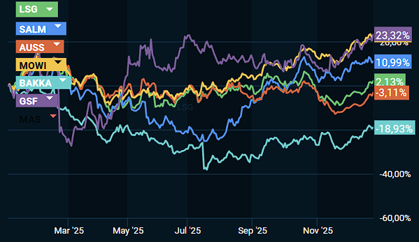Grieg Seafood er, med en oppgang på 23,3 prosent, den av de store lakseoppdretterne som har gjort det skarpest på Oslo Børs i 2025.