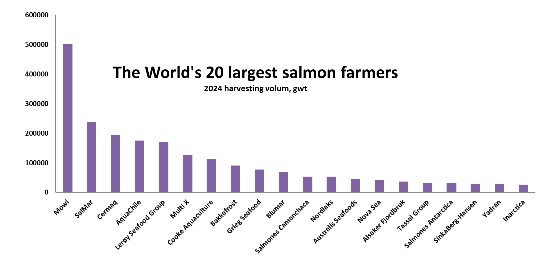 Mowi er fortsatt verdens klart største oppdretter av laksefisk. Basert på slaktetallene for 2024, slaktet Mowi mer enn dobbelt så mye fisk som nummer to på listen, SalMar. På bronseplass kommer et annet norsk-basert selskap, Cermaq, som riktignok er eid av japanske Mitsubishi.