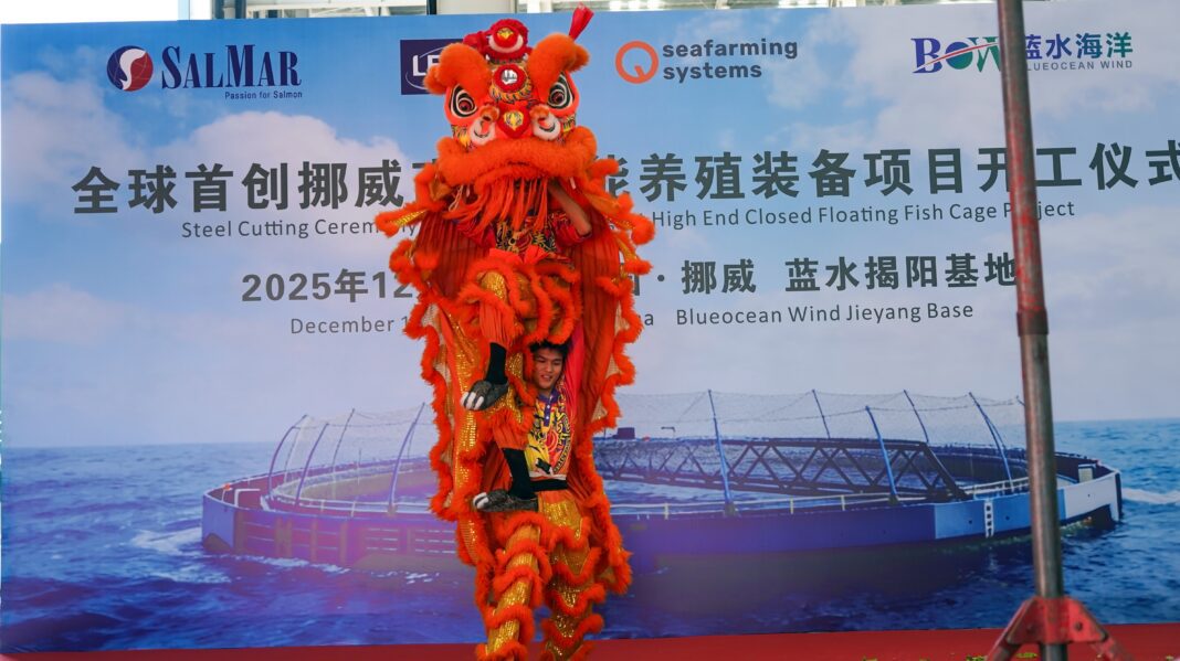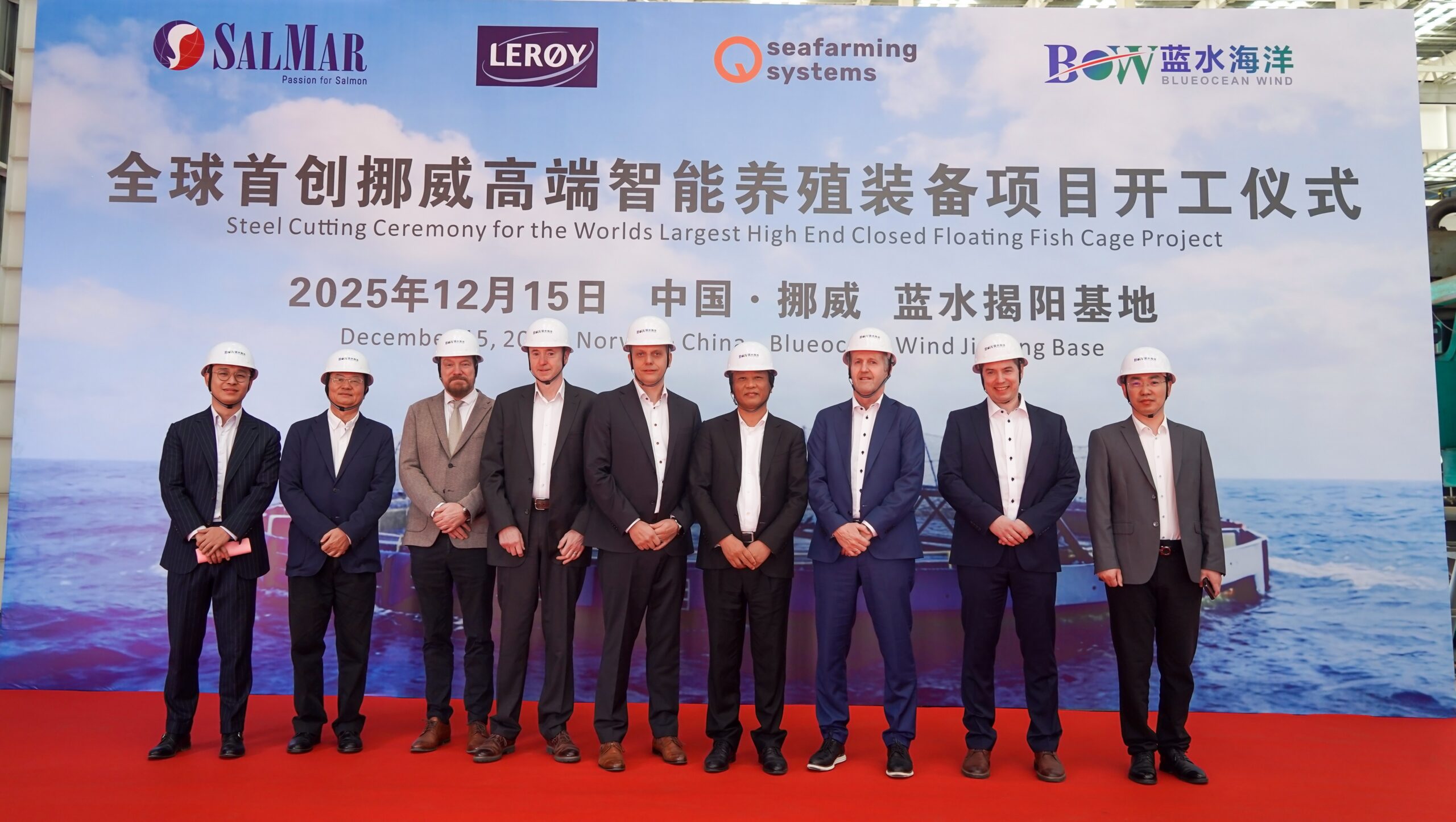 I dag er det gjennomført stålkutting for seks lukkede Aquatraz C2-merder ved Blue Ocean Wind-verftet i Kina. Tre av merdene skal leveres til SalMar og tre til Lerøy Seafood Group, med planlagt levering omtrent ett år fra nå.