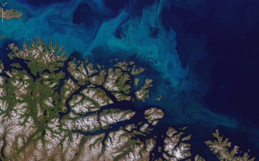 Algeoppblomstring langs kysten i 2017. Dette er et illustrasjonsbilde, og ikke et faktisk bilde av algeoppblomstringen som pågår i Sør-Norge. Foto: NASA