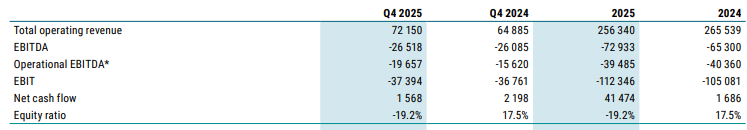 “På morselskapsnivå endte egenkapitalandelen* på 26,1 % etter å ha sikret et ansvarlig lån på 7,5 millioner kroner i løpet av kvartalet, og 52,5 millioner kroner relatert til den rettede emisjonen i kvartalet er innregnet som kortsiktig gjeld som skal konverteres til egenkapital i 1. kvartal 2026. På dette grunnlaget er selskapet ikke i brudd med noen lånebetingelser innen utgangen av kvartalet. Selskapets prognoser for 2026 viser en positiv kontantstrøm, og forventer ikke å være i brudd med noen covenants i løpet av de neste 12 månedene,” fremgår det av selskapets kvartalsrapport.