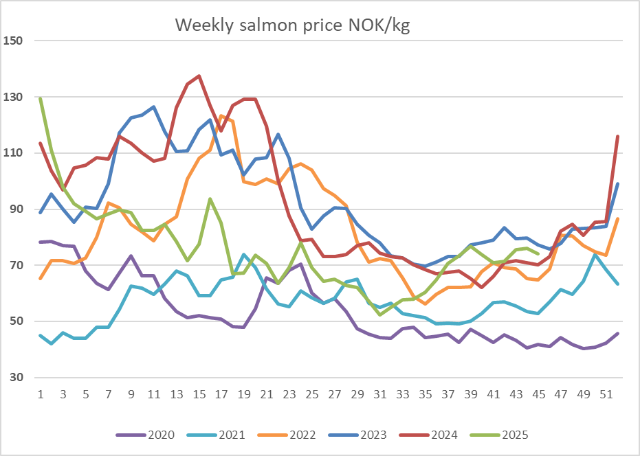 – 73-74 kroner til oppdretter på 3+. Jeg vet folk har kjøpt på 75 kroner i Oslo. Det er en liten nedgang. En brukbar nedgang på storfisk, men for 3-4 er det ikke så mye nedgang.
