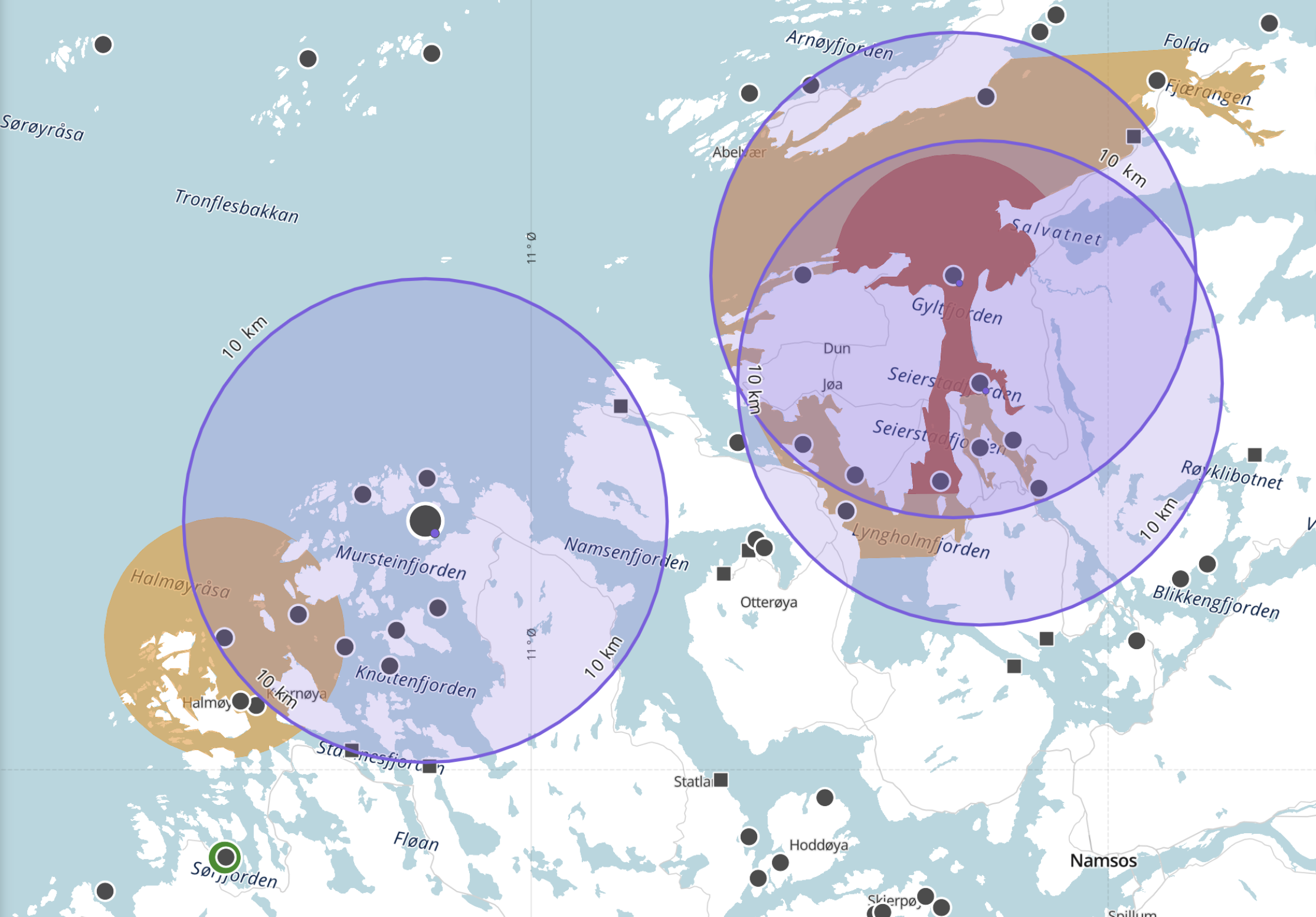 Lokale tilpasninger ut fra antall lokaliteter i området, avstandsforhold og strømforhold etc. vil legges til grunn for restriksjonssonens utbredelse.