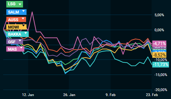 Anført av laksekjempene Mowi og SalMar, falt sjømatsektoren 2,3 prosent i livlig handel mandag.