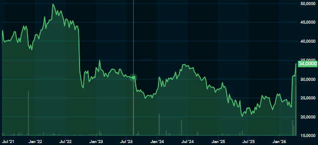 Måsøval-aksjen stiger 3,7 prosent fredag formiddag – til 34 kroner. Det er det høyeste kursnivå siden januar 2023.