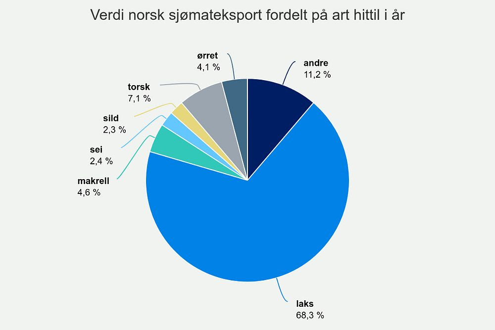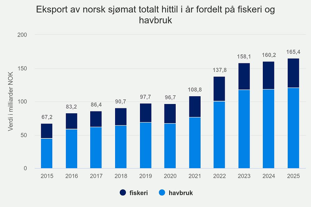 Hittil i år har Norge eksportert sjømat for 165,4 milliarder kroner. Det er en økning på 5,2 milliarder kroner, eller 3 prosent, sammenlignet med samme måned i fjor.