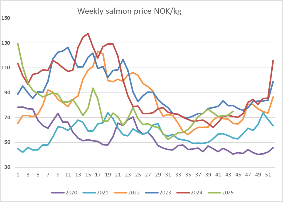 – Litt opp. Men det virker som det stabiliserer seg, sier en innkjøper om lakseprisen. Han viser til følgende prisleie, til oppdretter, for fisk som skal leveres den kommende uke:
