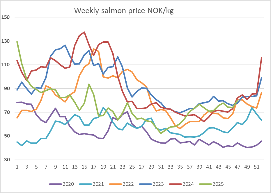 Han viser til følgende spotpriser, til oppdretter, for laks som skal selges den kommende uken: