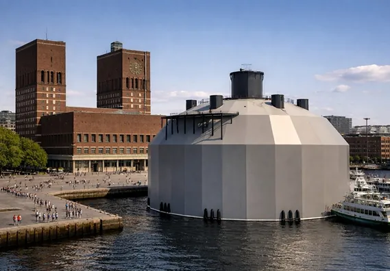 FishGLOBE har en signifikant størrelse. Her satt opp mot Rådhuset i Oslo. Illustrasjon: FishGLOBE
