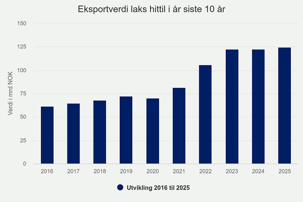 - Norge eksporterte 1 414 909 tonn laks til en verdi av 124,7 milliarder kroner i 2025