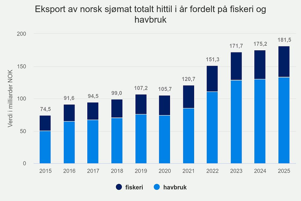 - I 2025 eksporterte Norge 1,5 millioner tonn sjømat fra havbruk