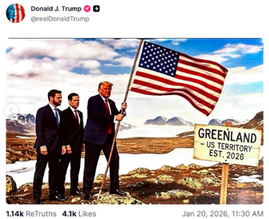 20. januar la Donald Trump ut dette KI-genererte bildet på Truth Social. Bildet levner ingen tvil om at Trump ønsker seg Grønland, og det snarest. Foto: Skjermdump fra Truth Social