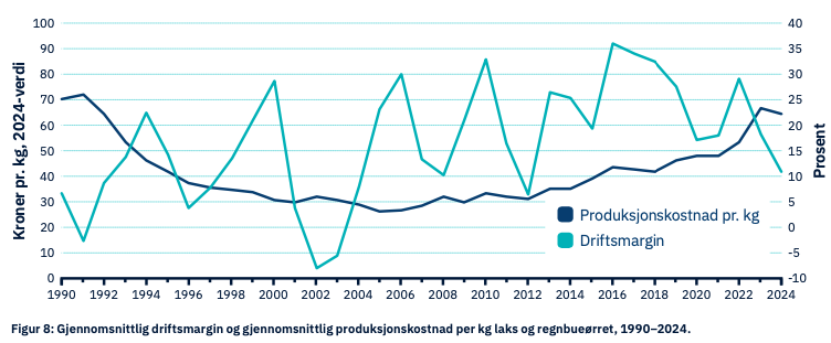 «Lønnsomheten i matfiskproduksjon av laks og regnbueørret er påvirket av svingningene i markedsprisen for laks og regnbueørret. I tillegg har strukturendringene, som ble gjort i forkant av innføring av grunnrenteskatt i 2023, påvirket lønnsomheten de siste årene,» skriver Fiskeridirektoratet.