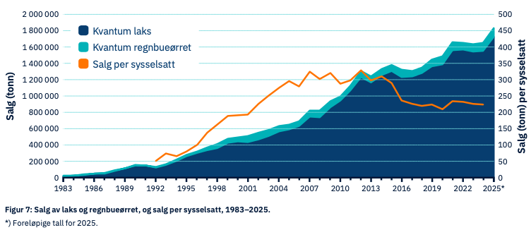 I årsrapporten for 2025 omtaler Fiskeridirektoratet utviklingen i salg og lønnsomhet i akvakulturnæringen. Her slår de fast at produksjonen per lokalitet har mer enn doblet seg i løpet av de siste 20 årene.