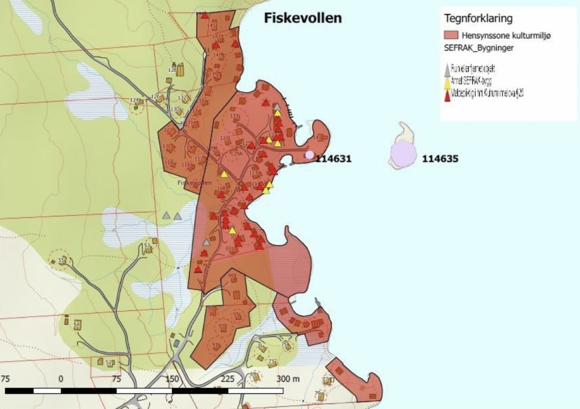 vikingtiden. Vollen omfatter 59 eldre bygninger, både naust, buer og kjell. Kartutsnitt hentet fra Kommunedelplan for kulturminner og kulturmiljøer 2019-2030, Rendalen kommune