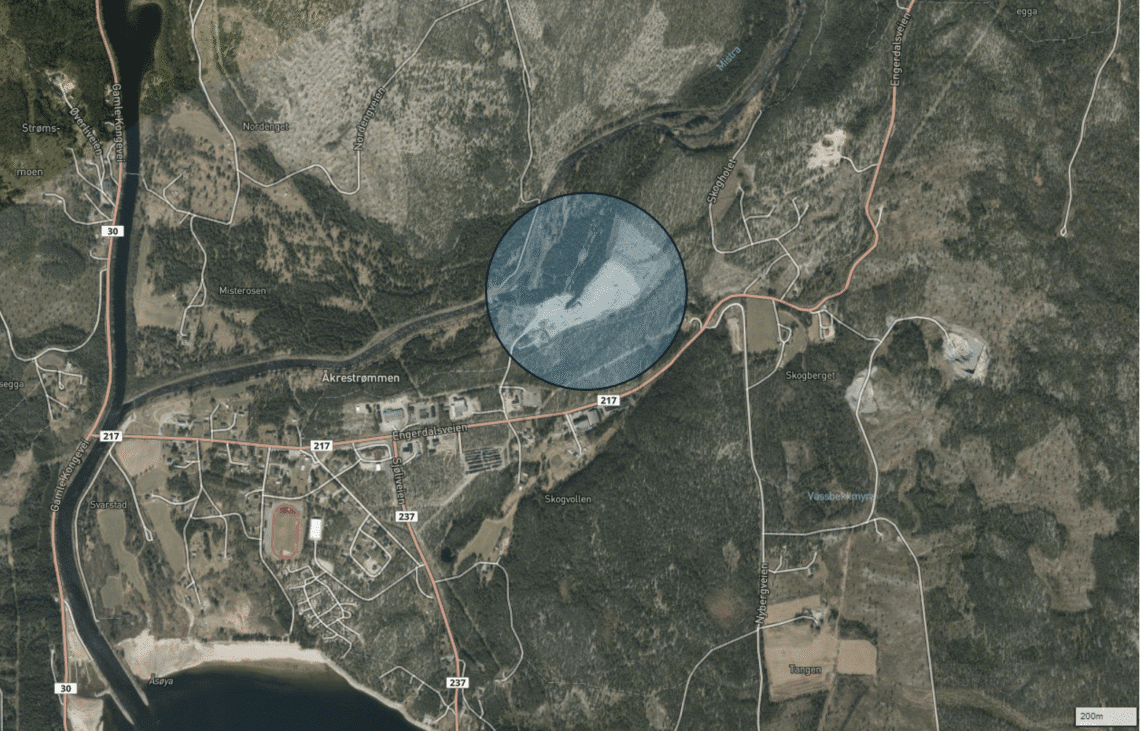 NAPOP sitt planlagte anlegg skal ligge øst for Åkrestrømmen, på sørsiden av elven Mistra. Bilde/grafikk: Rendalen kommune