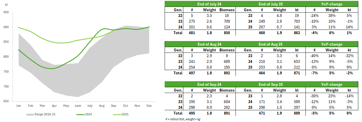 “Den negative veksttrenden snudde for fôrforbruk og smoltutsetting i løpet av måneden, noe som er et positivt datapunkt for vekst fremover. Vi forventer likevel at biomassenivåene vil forbli flate år/år eller litt under fjorårets nivå. Med biomassen som består av færre individer med høyere vekter, er vekstpotensialet frem mot 2026 fortsatt dempet. Med slaktetoppen sannsynligvis bak oss, ser vi medvind for spotprisene i fjerde kvartal 2025,” kommenterer Rosenberg.