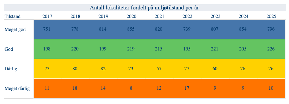 Ved ti oppdrettslokaliteter, av totalt 1.108 lokaliteter som ble sjekket i 2025, ble bunnforholdene vurdert som «meget dårlige», mens de ved 76 lokaliteter ble vurdert som dårlige. 796 lokaliteter fikk best mulig score, mens bunnforholdene ved 226 lokaliteter ble vurdert som gode.