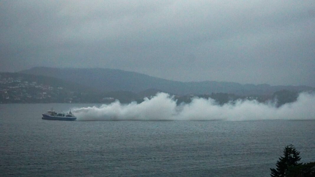 Så ble denne delen av Byfjorden relativt tåkelagt. Like før klokken elleve kom det mye av det som kunne se ut som damp eller røyk fra båten.
