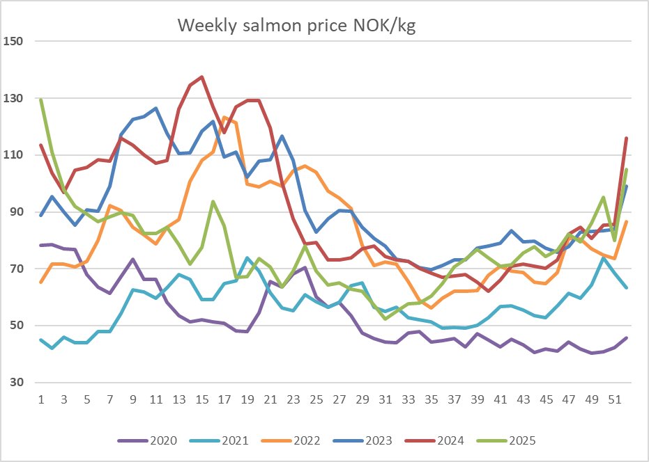 Det ligner en reprise fra i fjor. Da steg lakseprisen fra 85 til 115 kroner i årets siste handleuke.